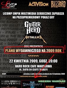 近日国外媒体爆料称他们接到波兰当地游戏发行商LEM本年度的游戏发行会。邀请函上红色的部分是波兰语,意为“2009年发行计划”。邀请函右上角是动视和暴雪的标志。游戏方面除了显眼的《吉他英雄》之外还赫然列有《星际争霸2》。