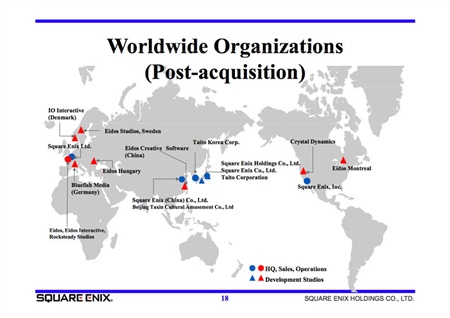 借助收购合并,Square Enix得到的是新的市场和更大的版图,对比一下上下两幅示意图(可以放大)你就会明白,从今往后Square Enix的水晶光芒将会照耀更多的国家和地区,不仅有亚洲、北美和欧洲,还包括南美甚至非洲。