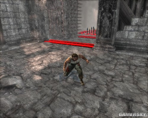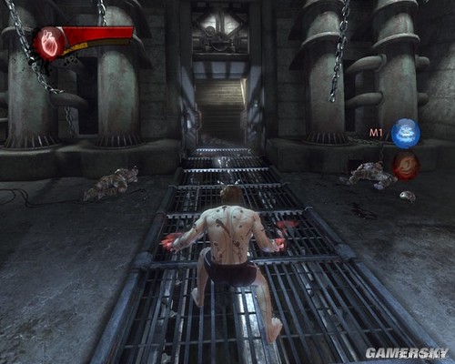 一路杀上去后,进入一个牢房,里面有蹲着一个拿大炮的家伙,对方站的平台是跳不上去的,只有靠Z键来反弹**炸死对方。