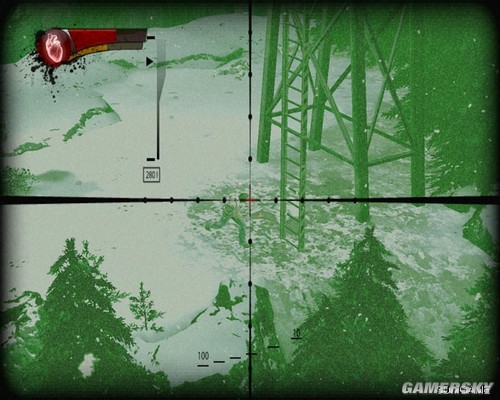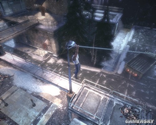 被人狙击的感觉很不爽啊,通常这事都应该是由我来干的……从塔的楼梯上去,然后攀上绳索滑过去。