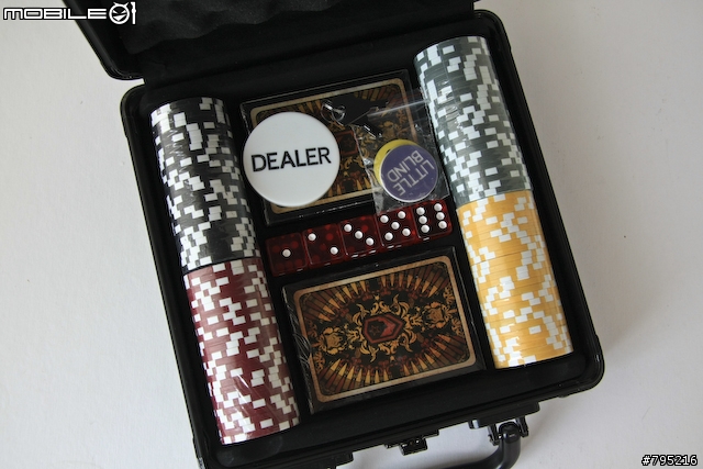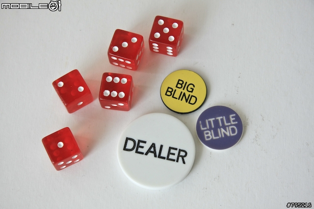 ▼这是大盲注跟小盲注,还有发牌者的牌子,都是塑胶制,字体是刻出来而不是贴纸。五颗骰子是红底白点,乍看之下很漂亮,但若拿起来仔细看就会发现有点粗糙,不如想像中的光滑透明,是整个扑克牌组合中最可惜的地方。