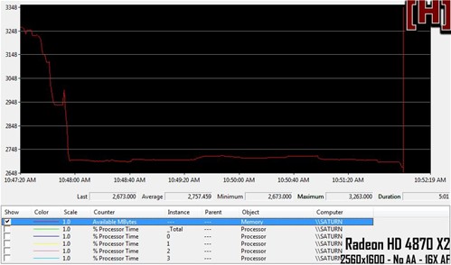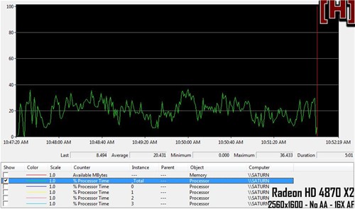 同样为了避免造成测试平静,ATI显卡CPU占用率测试当中选择了RadeonHD 4870 X2显卡。游戏设置依然为2560x1600分辨率,关闭抗锯齿以及各向异性过滤。下图当中,第一张为四核CPU的总占用率,第二张为四核CPU每个核心的占用率。总体来说,使用RadeonHD 4870 X2后CPU占用率相比GTX295稍稍降低了一些,幅度大约7%左右。