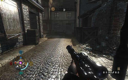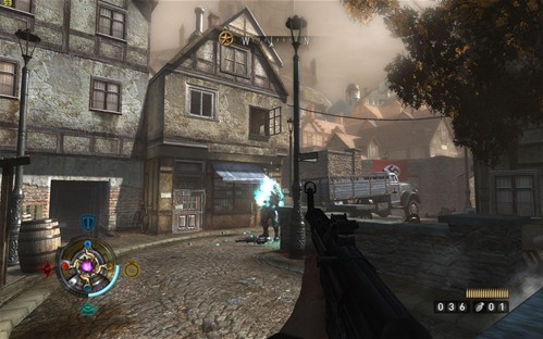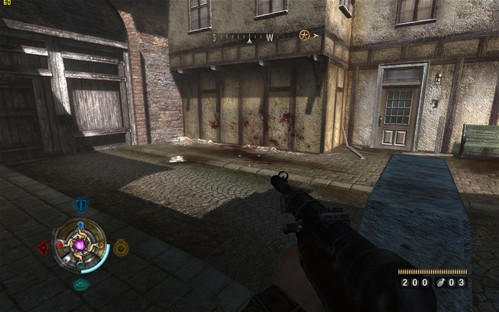 《德军总部》由Id Software提供技术和授权,由Raven Software公司制作,Activion发行。这款游戏依然采用了基于OpenGL的引擎开发,不过由Quake3换为了DOOM3增强引擎。虽然如此,但是对于主流的DX10l来说,这款游戏在画面上已然落后时代,与现在光影绚丽的新游戏相比,其画面风格显得非常落伍。