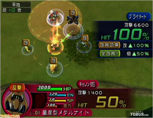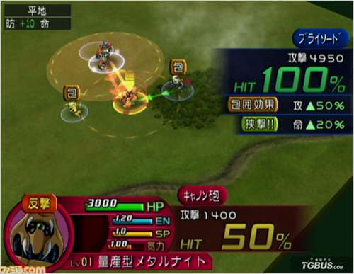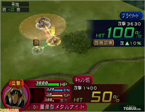 在此系统作用下,当敌机体周围一定范围内有我方机体存在,发动攻击时攻击力将得到增强。在进行攻击时,会出现“被包围区域”,在该区域中若有我方机体,则出现“包围效果”,我方一机体攻击力提升10%,而不同的包围状况,会出不同追加效果。