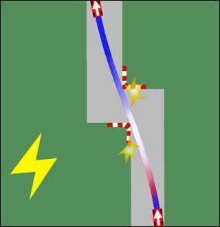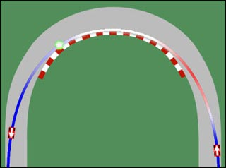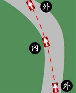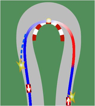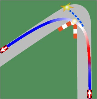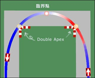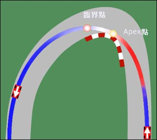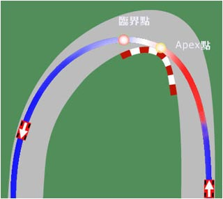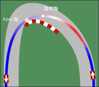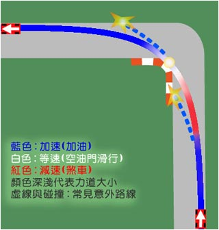 图组中大部分的进弯是以一种被称为"外-内-外"的方式来表示出来的,所谓的外内外,指的是车子通过弯道的路线,从接近弯道到进入弯道再到出弯的所走的那条线~ 路线中最接近弯心的那一点称为"APEX"点,通常"外-内-外"的"APEX"点刚好会是中间那一点,除了一些不用煞车减速就能通过的弯道外,APEX点通常也会是动力上的临界点(critical point)~ 以临界点作为分界,在这之前属于减速入弯的阶段,临界点之后就属于加速出弯的部份~ (事实上我还找不到专有名词形容入弯后开始加速出弯的那个点,这里暂时先以临界点称呼)~ 有人会质疑,采用科学上的计算,连接两点之间最短距离的应该就是最接近直线的线(当然能直线是最好),因此若拿通过发夹弯的路线来讲,最短的线应该是"内-内-内",而不是“外-内-外”,单纯以距离而言,"内-内-内"的确是最短的线没错,那为什么赛车却要走"外-内-外"呢~?"内-内-内"确实是最短的线,但实际上赛车通过弯道最先考虑的是"能最快通过弯道的线",至于是不是最短的线倒并非绝对因素,赛车首重是时间,而不是距离,数学上"内-内-内"是最短没错,但在实际上,行走"内-内-内"的路线会使得赛车进出弯的速度落差极大,为了要在这么小的回转半径通过弯道,车速势必要降很多,对于出弯的加速极为不利,反而"外-内-外"虽非最短路线,但它却能提供赛车以比较高的速度过弯,两者相较之下,反而是外内外以比较短的时间通过弯道,而 "时间"正是决定比赛胜负的因素!以过弯而言,赛车追求的不只是最快速的通过弯道,还有最快的出弯速度,倘若只是比别人更快进弯,但出弯若是慢慢来还是会被对手赶过去,反之若有比对手更快的出弯速度,那即使是跟在对手后方,出弯后仍然可以超越他~!因此还有一种重视出弯速度的外外内取线~ 听来"外-外-内"似乎是有更快出弯速度与能突破"外-内-外"防御的优点,但凡事总是一体两面有好有坏,"外-外-内"还是有其隐忧,主要是在于进弯时偏外的路线~