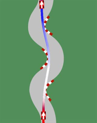 本章总结:通过以上的学习,相信大家已经领悟到了"行车路线"的重要性,正是通过路线来改变弯角的大小,选择正确的路线进入正确的弯角,适当的加速、减速,可以让车辆的离心力和惯性作用不像起初那样难以控制,只要选对了路线,调整好入弯速度,你就能发现其实NFS_13 SHIFT是一款很好操作的赛车游戏,其实并不是因为物理操控上困难而使你难以操控,而是你选择了错误的路线和速度去过每一个弯角,通过先前的学习和了解,现在你对此情形应该是可想而知了吧~ 那样的过弯,当然是非常难~ 非常非常难~ 以至于你觉得NFS_13真的好难操控.....~