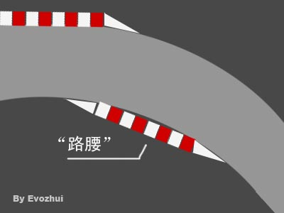 ■如图2所示:赛道两侧红白相间的格纹条带即为"路腰","路腰"都基本相似,只是不同的赛道会根据设计采用不同颜色的"路腰"进行铺设~ "路腰"的表面略比赛道表面粗糙些,为的是增大摩擦力,当赛车进弯或出弯时边侧轮胎行驶在"路腰"表面时,能够通过增大轮胎与表面的摩擦力来防止车辆进弯出弯时的侧滑,同时也对进、出弯车辆有一定的减速和加速作用;所以我们通常会经常看到电视转播或一些竞赛节目中的现象,很多辆赛车进弯或出弯时都会非常整齐的排成小队依次压着"路腰"进出各个弯口,这就是因为大家都选择了正确且最佳的行车路线,所以才会排成小队过弯,而之所以压着"路腰"过弯,就是因为"路腰"的位置正是在最佳的行车路线上!了解了"路腰",下面我们就开始细说"行车路线"...