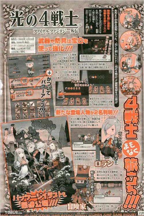 SE预定与10月29日登陆NDS平台的《最终幻想》系列最新作品《光之四战士:最终幻想外传》,这款游戏以“将过去时代的RPG以目前的新技术创造出最新表现”为主题,描述了水晶、龙等等经典的RPG幻想题材。同时本作是《最终幻想》系列的完全新作,本次游戏还请用曾制作过NDS平台的《FF3》、《FF4》复刻重制版的原班人马来进行制作。