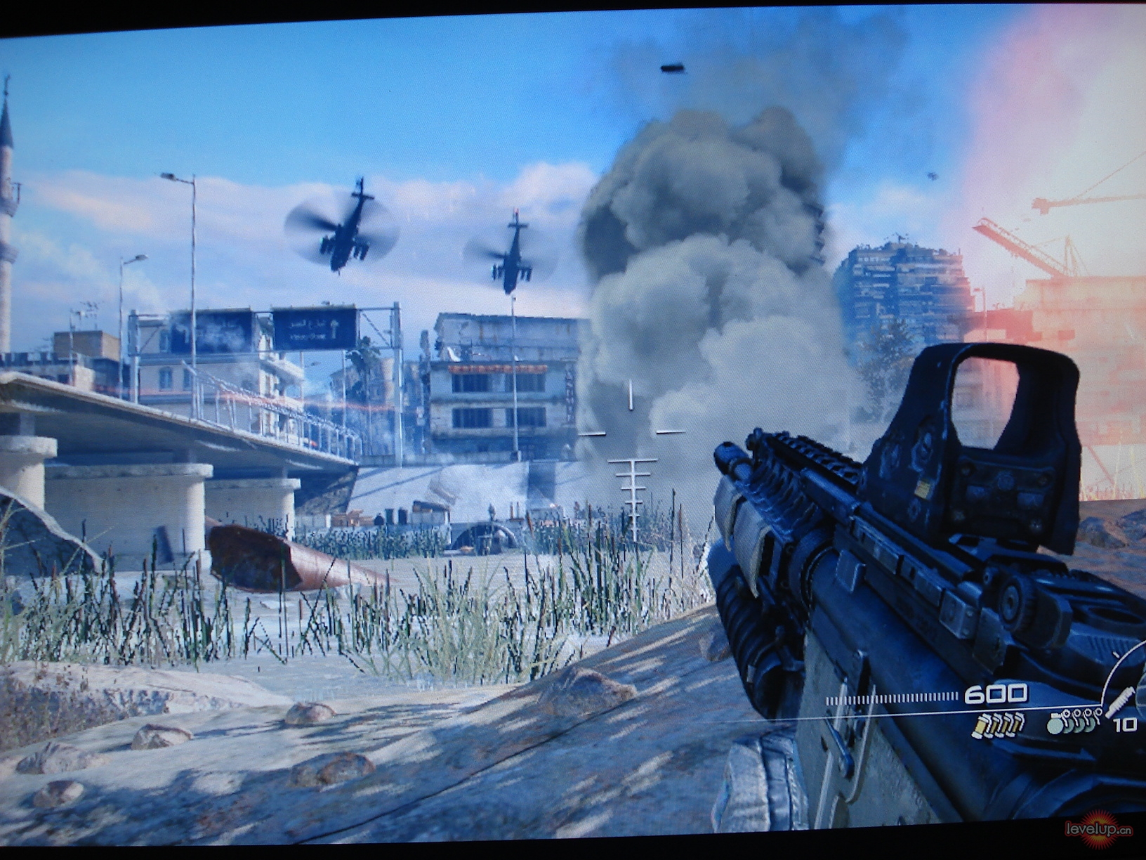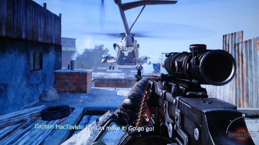 本关的战争气氛的做的非常的好,火红的夕阳与远处的爆炸,让人分不清到底是鲜血还是余辉染红了整个大地,后半段直升机扫射的部分的射击感非常强大,绝对的赞,真是不得不感叹这是真正的现代战争啊。