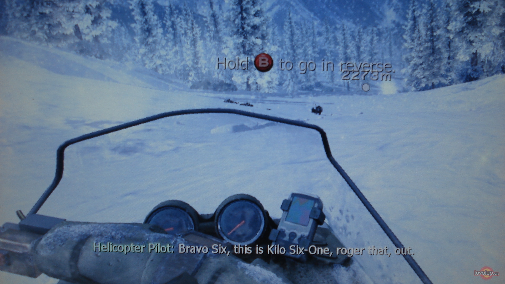到达目标地点油站后,埋下C4炸药为后备计划B准备。随后来到下一个目标地点与中尉汇合,进入建筑物候中卫会干净利落的收拾掉一个敌人,玩家的任务是去2层寻找ACS模块。捡到模块后Mac中尉被敌人的部队包围,接下来在敌人倒数之前按下引爆按钮,爆炸的C4炸药会在瞬间吸引敌人注意力,此时立即拔枪射击。之后更随中尉一路逃亡,注意路途中会有敌人的雪地摩托出现,被撞倒的话会直接毙命。逃出基地后开火干掉几辆雪地摩托,就会开始摩托逃亡战,玩法类似赛车,RT键加速LT键可以射击,小心的躲避敌人的攻击,然后刺激的飞跃过悬崖即可完成本任务。