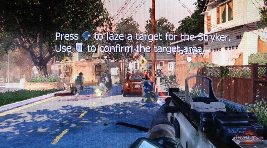 任务回到夕阳西下城市战场中,任务开始后随部队前进,部队中有一辆装甲运兵车作为我军的掩护。按下方将键“→”可以通过激光引导装甲运兵车攻击目标,多多使用可以轰杀掉不少敌人。通过装甲车的支援,依次将2点钟方向的橙色,黄色和灰色房屋中的敌人清理完毕。下个敌人聚集地是10点钟方向的大型建筑,由于敌人火力过于猛烈,所以暂时不要跟随队长冲到太靠前的位置,在后边慢慢WS就可以。搞定这片区域后继续前进,在一辆消防车的背后有敌人的自动格林机枪,还是让装甲车上前搞定吧。