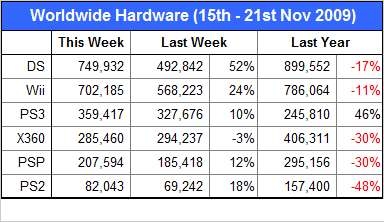 本周的全球销量相对以往有些微妙的变化,首先不变的依然是销量冠军wii在本周的发售的新超级玛丽兄弟的带动之下销量回升到了74W。由于众多大作的强力带动之下PS3的销量稳超对手X360,并且出现了46%的销量增张,不过好戏还在后头,12月份的《最终幻想13》发售后,相信PS3