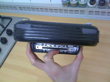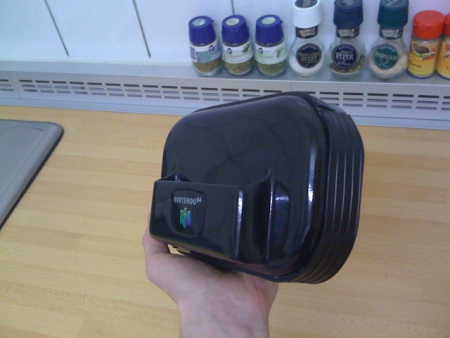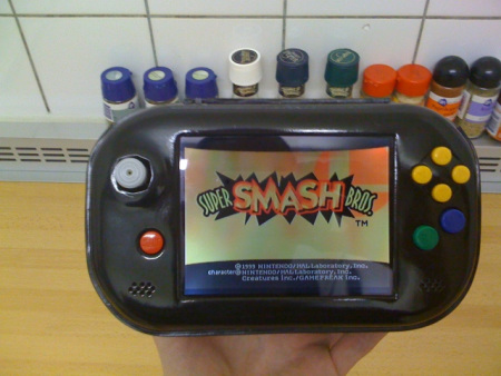 这台两个巴掌大的家伙叫做"N64Mini”,出自一名叫Zenloc的外国玩家,如图所示,Zenloc把我们熟悉的N64做成一台掌机,这台掌机利用4个电池驱动、附有充电器,画面亮度可以进行调整,游戏卡插槽位于后方,主机还加入麦克风转口以及可输出电视的**端口,遗憾是方向控制剩下摇杆,十字键不见了。
