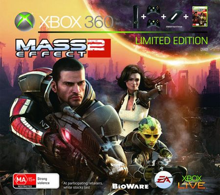 上面大家看到的是《质量效应2(MassEffect2)》的限定版同捆套装,对应发售地区为澳洲,发售日暂未公布,售价599澳元,差不多相当于550美元或3700块人民币。 这个套装包含一台250GB的黑色X360,也就是俗称的超级精英版,两个黑色的无线手柄,一副耳麦和一张