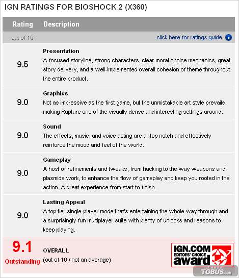 《生化奇兵2》将于2010年2月9日上市,对应XBOX360、PS3与PC平台。北美游戏媒体IGN于今天公布了他们对这部2K大作的评测,结果非常理想。《生化奇兵2》不仅成功地保留了前作的优点,而且还在续作中有新的突破,非常不易。最终被IGN给予9.1的高分评价。