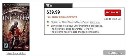 颇受国内玩家们期待的《但丁地狱》PSP版很可能在春节前没法与玩家们见面了,虽然欧美官网上的发售日期仍为2010年2月9日,但EA的官方在线预订似乎还没有货。几大零售商如GameStop、亚马逊的发售日都排到了2月22日,而日版按官方消息,在3月18日才会推出PSP版。按照时