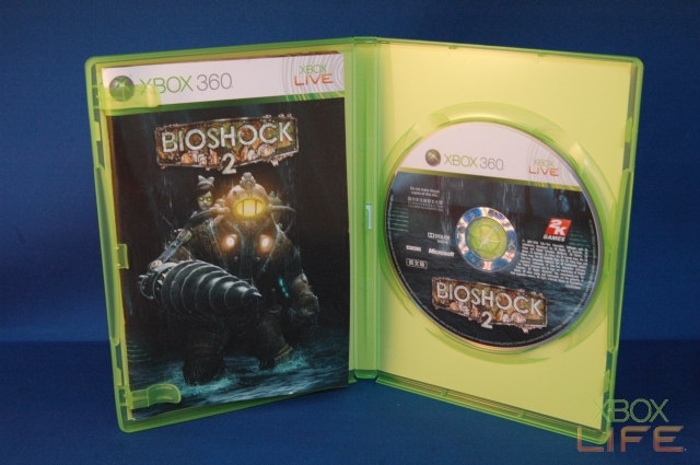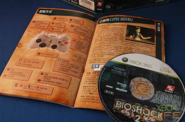 《生化奇兵2》的外盒包装上有非常精美的印刷,特别是烫金处理的游戏封面,更重要的是上面有压凸的「Bioshock 2」字样,让简单的包装看起来非常有质感。游戏说明手册的部份,这次依然采用全彩的印刷方式呈现,内容还包括中、英文二种语言,让玩家可以方便查阅。手册内容写得非常详细,建议第一次接触这款游戏的玩家,可以仔细阅读手册里所有的内容,相信可以加快玩家上手的时间。如果英文程度较差的玩家,手册的最后还有游戏选单、多人连线模式等的中英文对照,提供给需要的玩家翻阅。