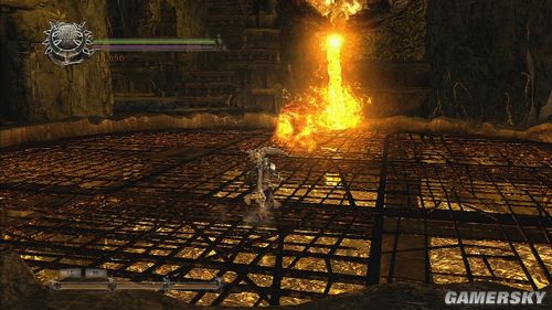 开启恶魔之门后,进入有记录点及罪人,再开启门,启动手把后,平台会降下,再启动一旁的手把,原本炎浆的地方升起平台,马上要与大型的怪物战斗。