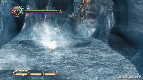 与维吉尔对话完也记录好后就从绳索往下,来到图的位置,这边要注意的是后方冰巨人会吹风,此时如果脚步不注意就会被吹下断崖,还有也要注意翼骑士的俯冲攻击,因为在这小小块的平台上,被冲撞到通常都是掉到断崖下,