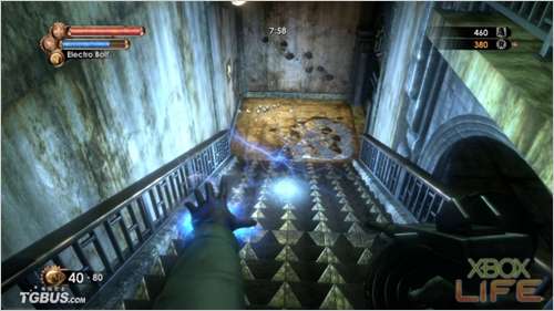 一开始就能使用的万能武器,准度高、威力中等,近、中、远都能发挥十足的威力。手枪搭配各种Plasmid都很好用,例如Electro Bolt瘫痪敌人后瞄头射击、Winter Blast缓速后连射都是常见的用法。