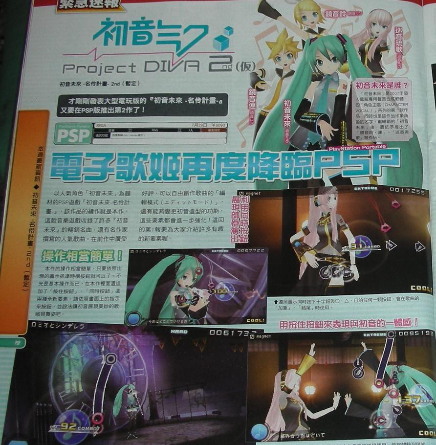 PSP《初音未来:歌姬计划2》(暂名)最新一期的中文杂志图发布,人气曲《magnet》、《罗密欧与灰姑娘》都确定将在游戏中收录,不得不说有这二首歌已经满足了,不过不知道炉心融解那些有名的歌能不能也一起被收录进去?