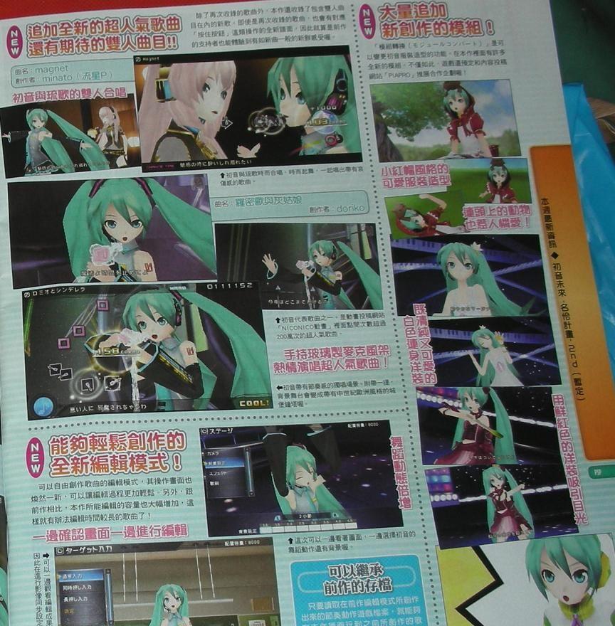 PSP《初音未来:歌姬计划2》(暂名)最新一期的中文杂志图发布,人气曲《magnet》、《罗密欧与灰姑娘》都确定将在游戏中收录,不得不说有这二首歌已经满足了,不过不知道炉心融解那些有名的歌能不能也一起被收录进去?新作除了收录人气歌曲之外,miku本身也是有不少新服装的,并且游戏也
