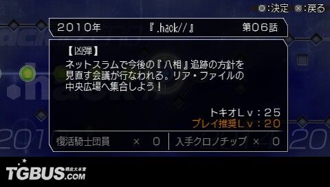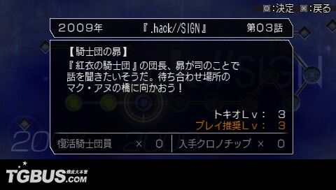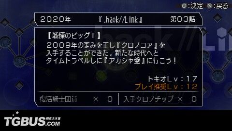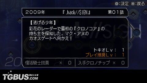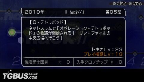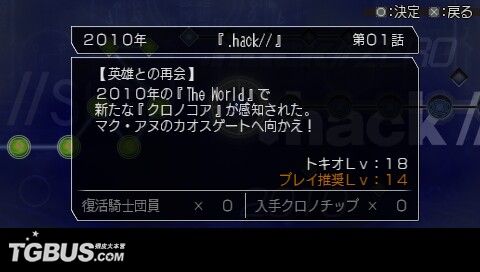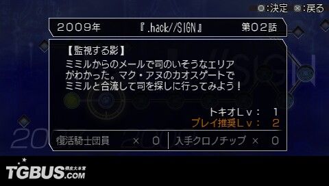 时郎醒来的时候,发现眼前是一个跟自己造型相似的古怪生物。说话最末还『Oh Ba Oh Ba』地叫……原来他被天城彩花救了,正在彩花的潜水艇内。彩花把修复『アカシャ盘』的任务交到时郎的手上。立刻前往『アカシャ年代碑』,可看到历代的.Hack系列都在碑上,每一个小孔代表那一代的一话故事。看来时郎要开始『穿越』的旅程了(小旭:难道是穿梭不同空间拯救世界的那位假面骑士……呃……我也穿越了……)。