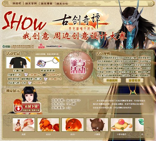 古剑奇谭:由上海烛龙苦心研发两年多、GameBar代理运营的的大型3D角色扮演游戏(单机游戏)。在带您游览阴森神秘的地下王宫之前,我们向您郑重推荐一下产品的第四波活动——SHOW出你的创意古剑奇谭周边创意设计大赛。参与活动、展示创意、实现梦想。点击进入活动引导页及素材下载地址:h