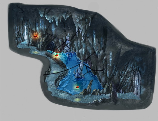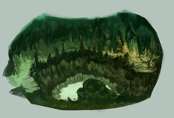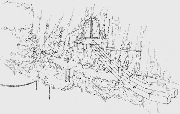 让我们再来看看上图线稿的庐山真面目——冰炎洞,巨大的石柱连接了山门和地面,看来这也是进入上层石门之内的唯一通道了。左侧道路蜿蜒向上,不知最终通向何处...