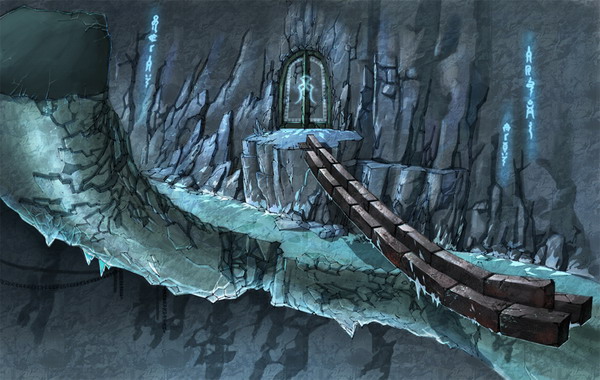冰炎洞内部场景之一,缠绕在怪石与石壁之间的锁链诡异莫测,崎岖狭窄的道路尽头似乎与外界相连,不知道紧闭的石门背后隐藏着什么秘密,门上的符文到底暗示着什么呢?