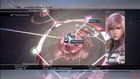 借助一个名为"Crystarium"的系统,《最终幻想XIII》对传统RPG的升级和成长系统进行了一番革新。这个系统有点类似于十代的晶球盘,你花费通过击败敌人得到的点数——Crystarium Points(CP),在Crystarium上不断移动,逐步开启各项加成或新能力的水晶,从而对角色进行培养。