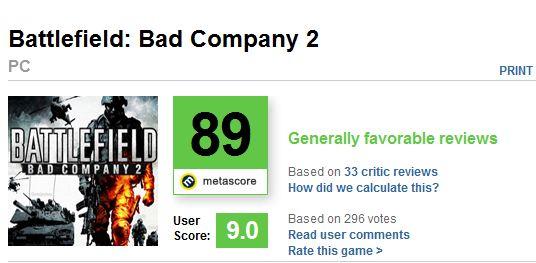 战完销量战评分,瞧瞧BFBC2和MW2在PC平台的得分——注意用户评分,那触目惊心的红: