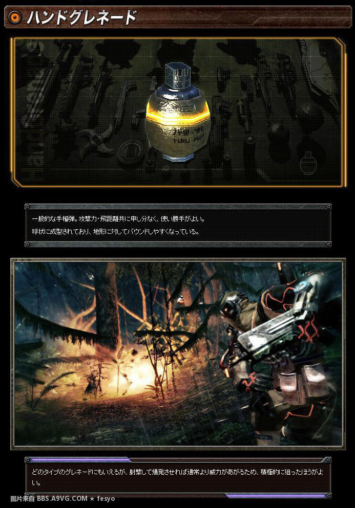 《失落的星球2》对应PS3和XBOX360平台,预定2010年05月11日发售。正式公测版本会在4月21日登陆XBLA,4月22日登陆PSN。《失落的星球2》放出了左右手装备的介绍,目前看来,右手装备都以枪支为主,而左收装备则以各种炸弹、手雷为主。右手装备武器您当前所处的位置:1
