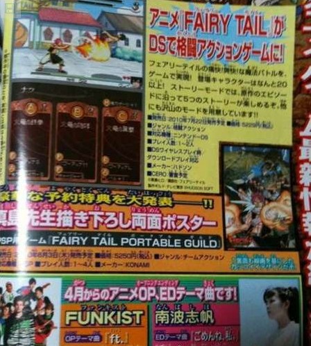 由真岛浩编著的少年漫画《妖精的尾巴》将游戏化同期登陆NDS和PSP双平台,登陆NDS平台的作品《妖精的尾巴DS》由Hudson制作推出,并将会是一款格斗游戏,再现原作的爽快魔法战斗场景。登场战斗人员将达到20名以上,按照原作玩家也将能够通过5条不同的故事线路进行游戏,游戏还有更多