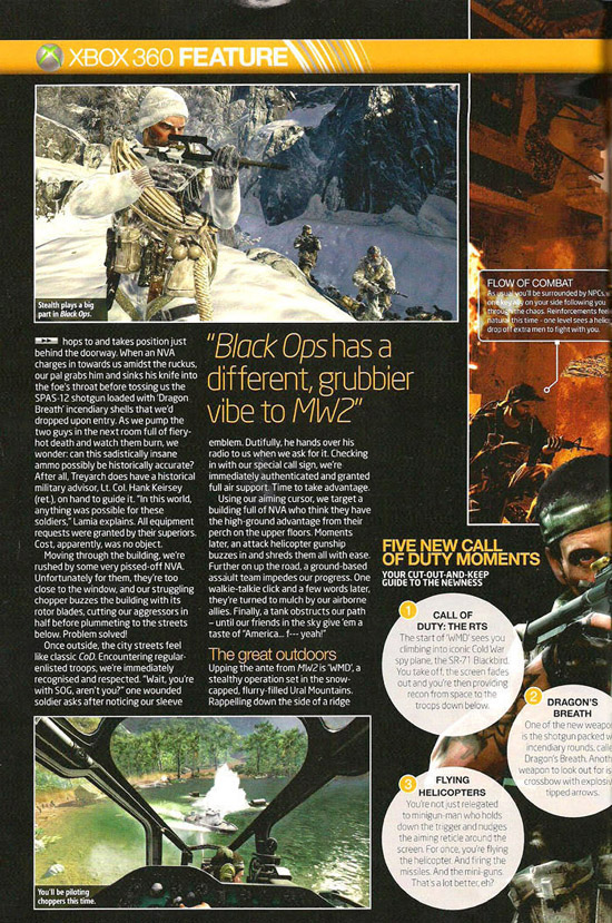 XBOX360官方杂志放出了最新的《使命召唤7:黑色行动》情报,从中我们可以得知Treyarch本次在技术上进行大提升,因此《黑色行动》将会有更好的画面表现,同时制作经验的积累也让众多新的特性开始加入到《黑色行动》中给玩家以新的游戏体验。