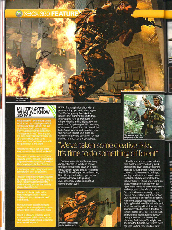 XBOX360官方杂志放出了最新的《使命召唤7:黑色行动》情报,从中我们可以得知Treyarch本次在技术上进行大提升,因此《黑色行动》将会有更好的画面表现,同时制作经验的积累也让众多新的特性开始加入到《黑色行动》中给玩家以新的游戏体验。下面我们就来看看本次《使命召唤7:黑色行动