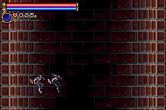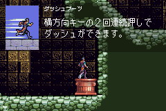 一路向下,途中打碎几只丢炸弹的骷髅(运气好还有卡片),来到了游戏的第一个区域:地下墓地。向房间右下角方向走,中途有一个SAVE房间(可以恢复HP,MP和主角状态),在前进过程中,得到重要道具[跑鞋?](双击方向键可跑动,跳跃更远),继续前进,途中可以得到几个提高HP、MP与桃心上限的东西(参考地图)一直来到第一个BOSS处(提示:为打BOSS方便,可以先去BOSS房下面有飞行棺材的房间把副武器换成圣水),打败它,在它身后房间得到重要道具[跳空石?](可以2段跳)