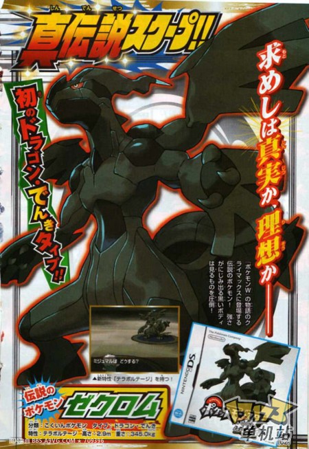 在最新的一期日本CoroCoro杂志为我们公布了两只神兽的资料,还为我们公布了许多新的妖怪。在本作中还将加入文字输入,玩家们除了可以通过wifi和世界各地的玩家们交流对战,还能通过语言沟通。神兽:赛克罗姆・【ゼクロム】属性:龙・电特性::テラボ儿テージ(効果不明)身高:2.