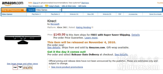 美国亚马逊网店现在已经开始接受微软体感外设Kinect的预订,价格为149.99美元。