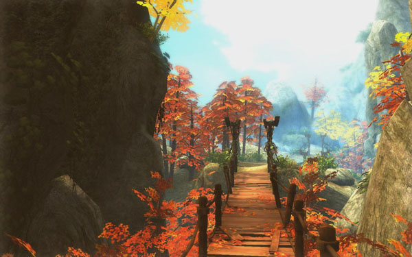 看过之前的场景截图,和许多玩家一样,曾对部分截图持怀疑态度,实际体验才发现截图表现和游戏中的实际表现差距还是挺大的。尤其是自然场景,不是简单的华丽堆砌,看得出来花费了不少的心思。图中为红叶湖一隅,植被错落有致,山林若隐若现,吊桥浑然天成,远近层次分明,结合背景音乐和音效能明显感觉到一股秋意扑面袭来。