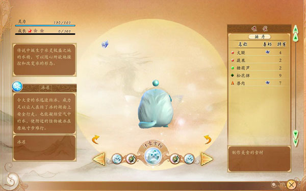 灵兽的设定是一个非常有趣的系统,可以通过喂食提高灵兽的成长,图中的沐零方相技能是冰冻,在特定的场景触发技能,可使人在结冰的湖面行走,也可使附近怪物冻住。目前灵兽还不能参加战斗,随着灵兽成长后形态发生变化,参加战斗应该不是件难事吧。