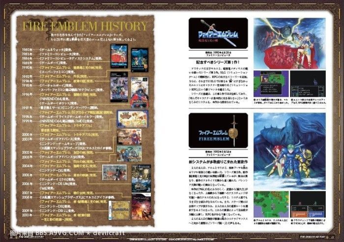 《火焰之纹章》的爱好者可以欢呼了,小学馆出版了《火焰之纹章》20周年官方纪念丛书。详尽的介绍了《火焰之纹章》的历史事件时间表和人物的资料,具有极高的收藏价值。在日本亚马逊网站已经开始发售。