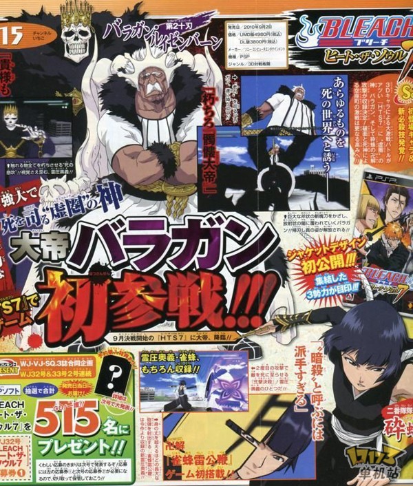 PSP死神系列格斗游戏《死神灵魂升温7》目前又有了最新的情报,作为“十刃”中年龄最大的拜勒岗将在本作中初次登场,另外杂志还向我们展示了碎蜂的卍解技能发动,一起来看一下吧! 《死神灵魂升温7》将在9月2日发售,登陆平台为PSP。
