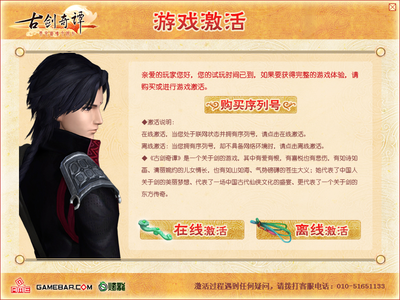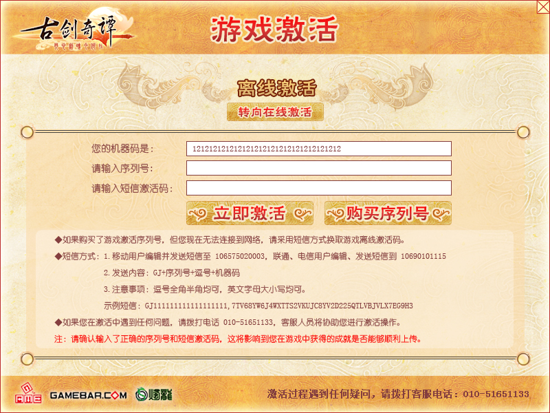 《古剑奇谭》采用短信互动的方式进行离线激活,玩家将产品序列号与机器码一同发送到指定号码(每条短信资费0.15元),即可获取激活码。如果在过程中遇到问题,请拨打客服电话,按照客服人员提示进行离线激活。