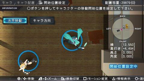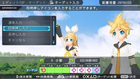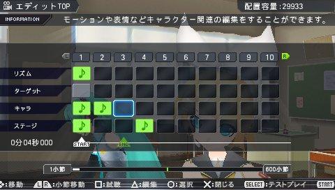 而在这次节奏游戏的谱面制作编辑模式方面,本作也加入了许多丰富的功能,同时也将整个界面简单化,玩家们还可以自己来设定能够赚取高分的“Chance Time”,体验更接近游戏主要模式的玩法乐趣;同时在这次的编辑模式里,还将会对应本作新追加的“长押”与“同时按住”等新功能,加上还可以编辑两名角色登场时的影像,以及能够在编辑的时候设定角色的视线、手上拿的道具、画面界面背景(例如下雨、下雪)等等,让玩家们能够获得更丰富的游戏乐趣。另外玩家们也可以将自己编辑的内容通过d-Hoc连线来跟其他朋友进行交换,让朋友也能享受自己辛苦制作的成果!