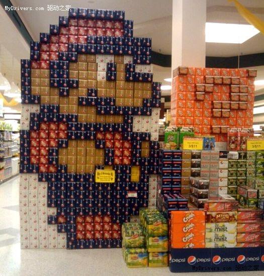 《超级玛丽》的粉丝团十分庞大,不过像下面这样张扬地表达对马里奥的喜爱的恐怕不多。美国的一家超市店主日前就用百事旗下的多款饮料盒搭建了一个马里奥大叔,旁边还有大家都熟悉的“?”号。虽然很多人不喜欢喝碳酸饮料,不过相信这样扎眼而又别具匠心的营销一定能促进销量,很多人被吸引地驻足观看。