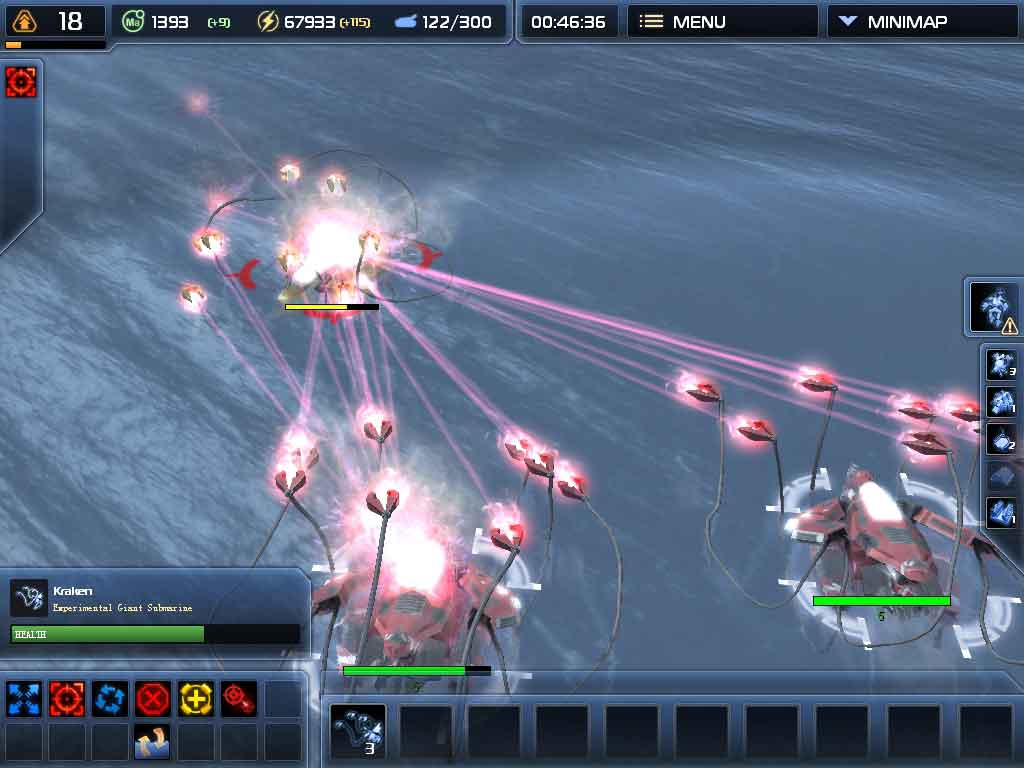 当低龄化与仿生学结合起来后,它的效果就更加恐怖。Cybran的试验型突击机甲Megalith曾经是恐怖的两栖移动炮台,却在《最高指挥官2》成为了可笑的机器蟑螂(它的前辈则是一只机器河蟹);Aeon启示派Illuminate的试验型突击战车Urchinow则是令人无语,这个圆滚滚的战车名字源自腔肠动物“海胆”,分类属于Assult Block(如果你无聊的话,可以把它理解成“突击板砖”);Cybran试验型潜艇“北海巨妖”Kraken属于名至实归之辈,这艘潜艇的确和Kraken一样能在海底自由穿梭,更美的是,这东西用来进攻的武器是8条触须……