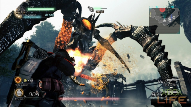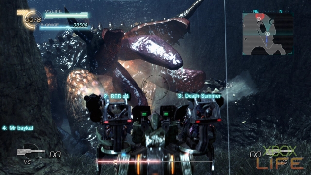 我们採分工合作的方式发动攻击,单人VS一开场就直接跳上Gordiant的背部,朝金黄色的尖突弱点猛攻(凯特叔叔有练过,在Gordiant表演跳水时有闪开);另外三人的复座VS则使用炮手的左右VS机抱与主驾驶的霰弹/单发抱专打膝盖,将Gordiant断腿就能让牠瘫倒在地。除了VS弹药用尽时需要离座安装新武器,头目战大部分的时间我们都待在机甲上,凭藉VS的强大火力迅速收拾了这隻黑不隆咚的过肥蠑螈。