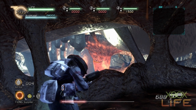 镇守1-3的头目,就是先前合作模式试玩版当中的六脚山椒鱼「Gordiant」。不过在面对巨大保育类生物前,我们得穿过丛林贼的最后一座阵地。气势正盛的我们一路扫平了挡路的VS与抱座(顺便拿Good Job奖励),用黄金拇指打开入口的大门,来到了一座堡垒。四人往敌方盘踞的高处直攻,不一会儿就拿下了顶端的Data Post,打开阻断桥梁的铁门。