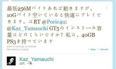 山内一典在其微博上称,256MB硬盘空间就可以运行《GT赛车5》,不过要想获得最好的游戏体验,他推荐拿出10GB的可用硬盘空间。